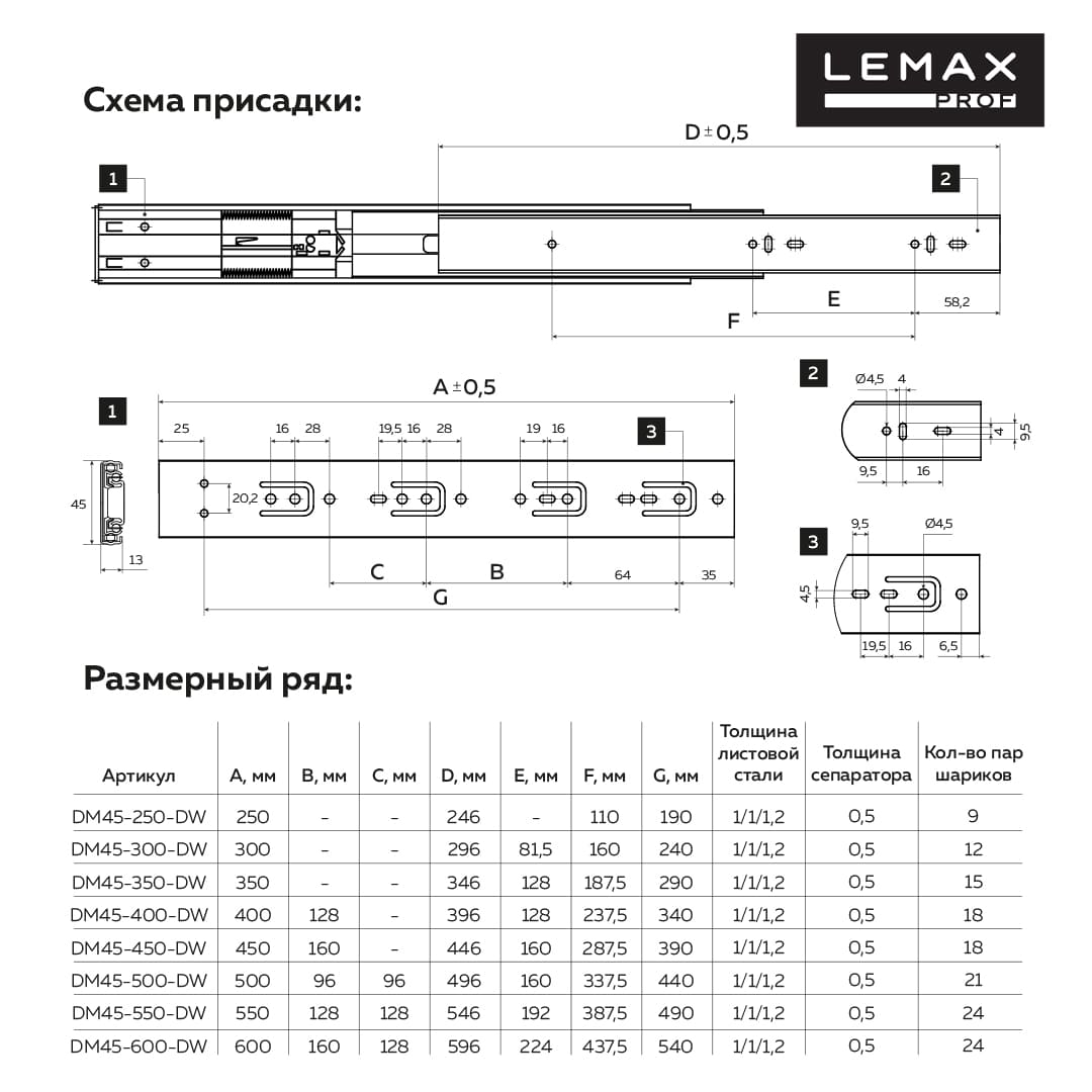 DM45-450-DW - шариковые направляющие 45 мм полного выдвижения с плавным закрыванием. Изготовлены согласно требованиям европейских стандартов. Направляющие обладают плавным бесшумным ходом, имеют высокую несущую способность до 35 кг и обеспечивают до 50 000 циклов открывания/закрывания. Представлены в длинах от 250 до 600 мм с шагом 50 мм.